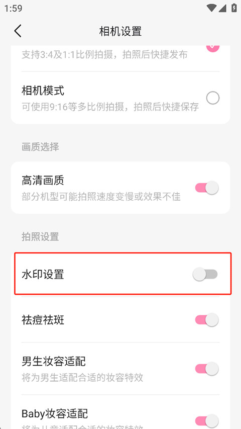3、找到“水印设置”开关,关闭即可(部分版本显示为滑动按钮)。