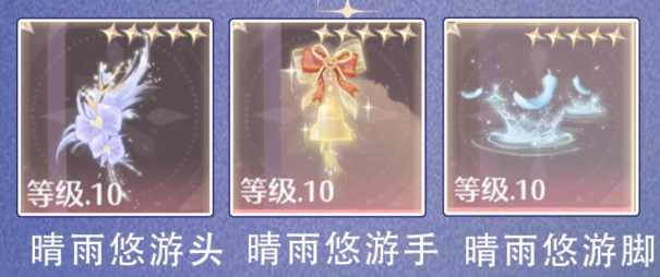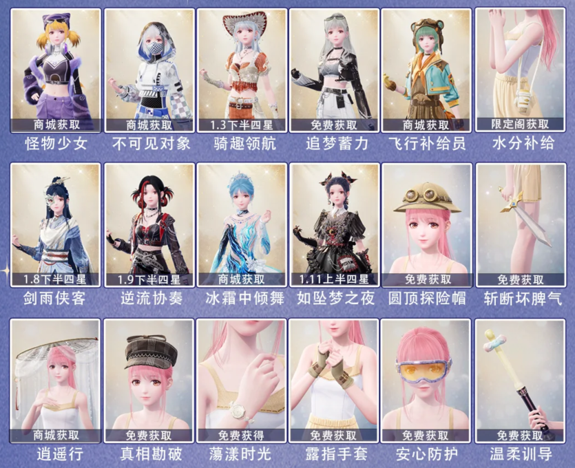 怪物少女、不可见对象、骑趣领航、追梦蓄力、飞行补给员、水分补给、剑雨侠客、逆流协奏、冰霜中倾舞、 如坠梦之夜、圆顶探险帽、斩断坏脾气、逍遥行、真相勘破、荡漾时光、露指手套、安心防护、温柔训导