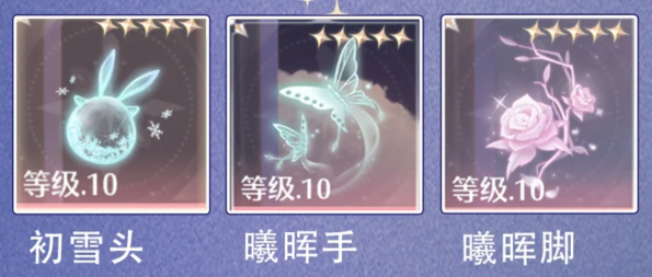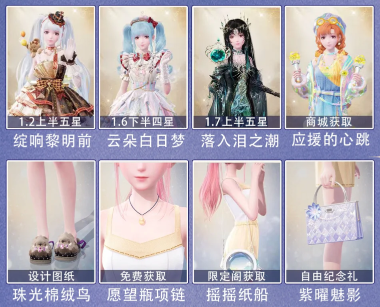 绽响黎明前、云朵白日梦、落入泪之潮、应援的心跳、珠光棉绒鸟、愿望瓶项链、摇摇纸船、紫曜魅影