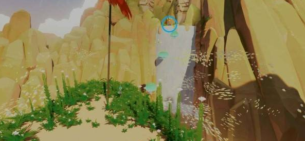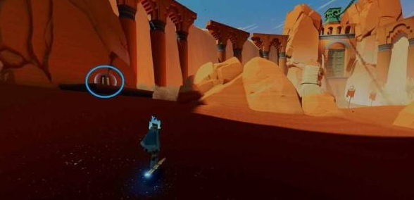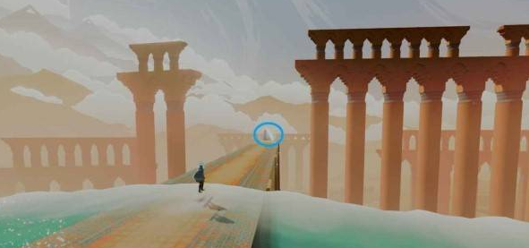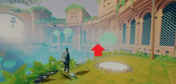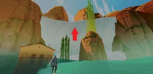 激活右侧链条的出水点,绕道建筑后方将海水归位,沿着海草往上爬到瀑布顶端,继续沿路往前走即可到达石板所在平台。