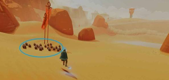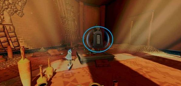 沿着左侧岩壁往前走可以看到斜坡上有一堆灯笼,点亮灯笼进入洞穴,继续前进并点亮第二堆灯笼,排光沙子后,沿着左侧道路进入洞穴到达出水点,与壁画右侧石板互动。