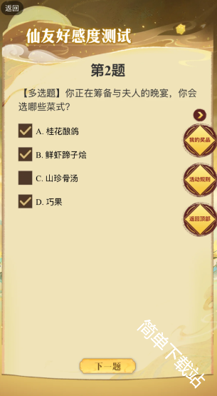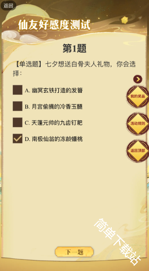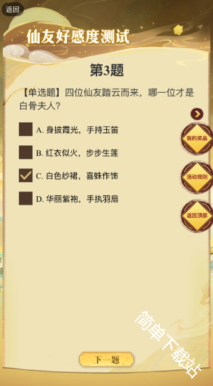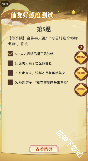 寻道大千2025七夕活动糟糕我被仙友包围了,需要根据对应角色的题目来进行选择答题,达成100好感度后即可领取奖励,下文是具体的游戏中关于白骨夫人的题目以及对应适配答案内容详情!