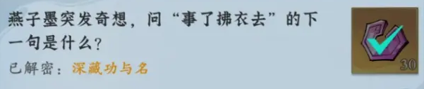 3、燕子墨突发奇想,问“事了拂衣去”的下一句是什么?深藏功与名